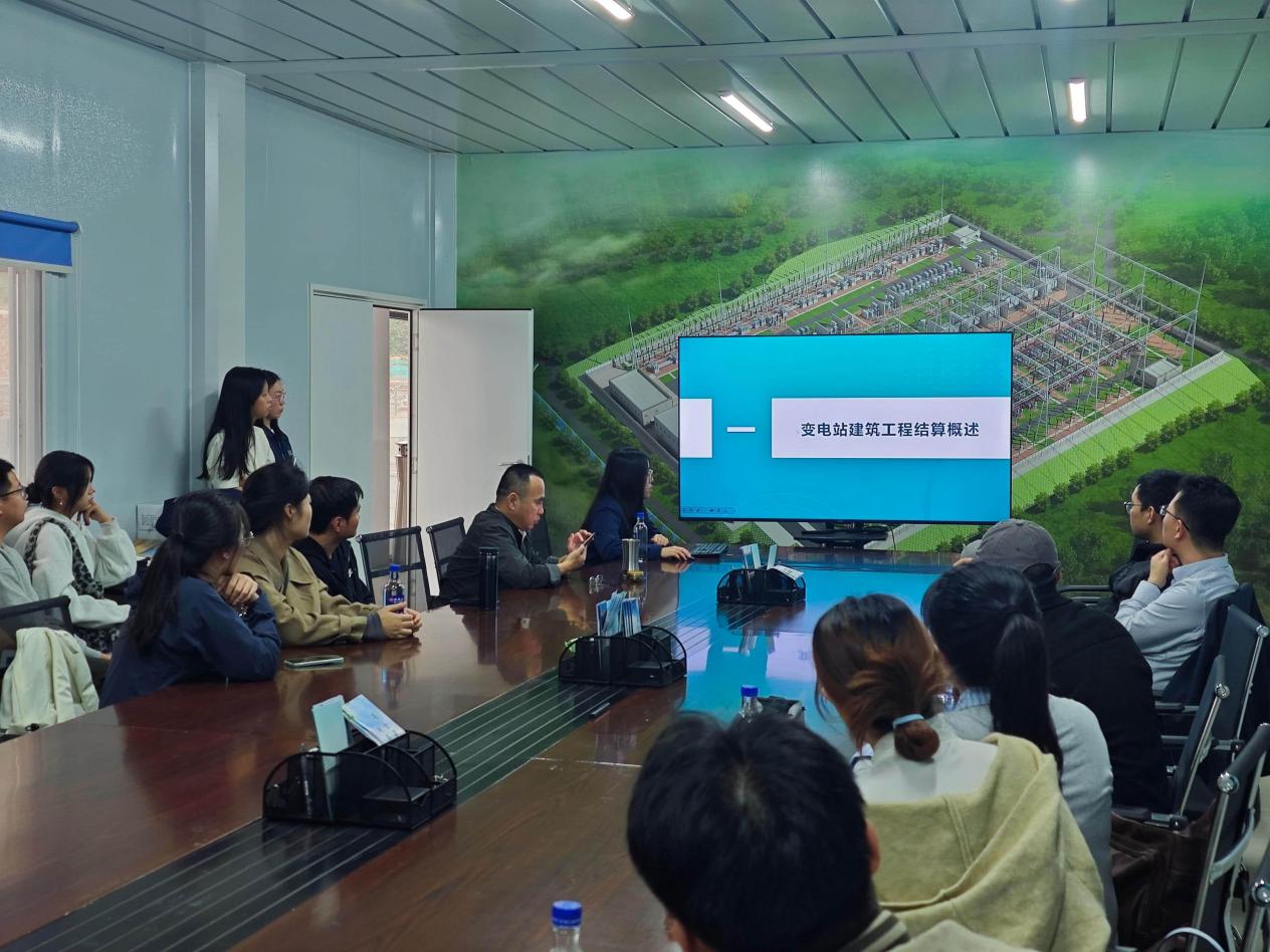 实习队伍首先参观了变电站的施工现场,项目部管理人员康武镇结合数字孪生模型讲解了工程概况、施工技术和施工进展情况等。随后,在项目部会议室,黄海主任介绍了变电站工程造价总体情况,造价管理人员林羽洁讲解了变电站土建工程结算审核应关注的问题。最后,老师、研究生与项目团队人员一道围绕现场管理、数字化技术应用、研究生能力培养等方面开展交流研讨。