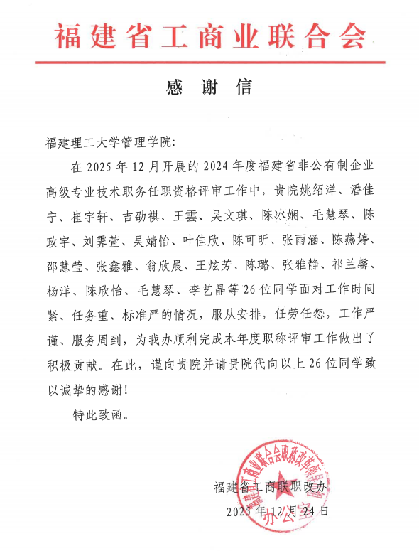 服务期间,志愿者们分赴材料审核、会务协调、联络接待等关键岗位,以高度的责任心和饱满的热情投入工作,全方位保障评审工作规范有序推进。福建省工商联特此发来感谢信,对志愿者们的表现给予高度评价,充分肯定了学院学生在公共事务中展现出的责任担当与优良素养。