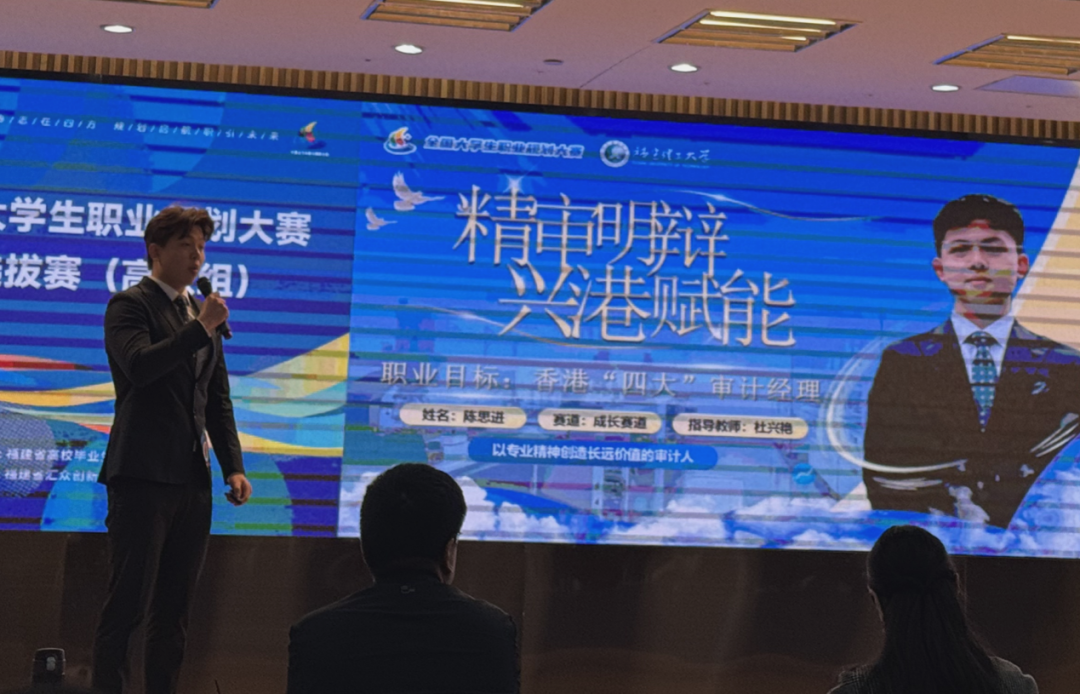 比赛过程中,陈思进立足审计学专业背景,结合个人成长经历与职业发展目标,系统梳理了其职业定位与发展路径,围绕行业认知、自我评估、能力提升与发展规划等方面进行了全面展示,思路清晰、目标明确、路径具体,这充分体现了新时代大学生对社会需求的理性认识以及服务国家发展的责任担当,得到了评审专家的高度认可。