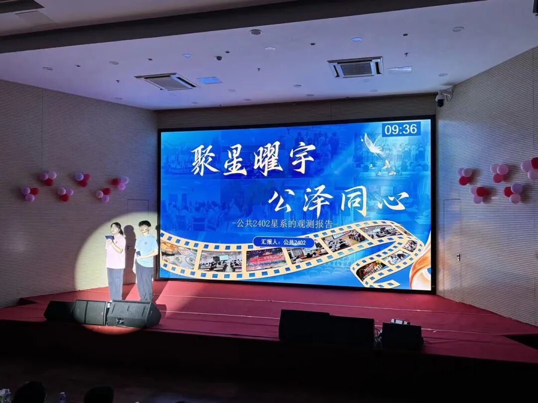 公共2402班以“公共2402星系的观测报告”为主题,将班级比喻为一个由29颗“星星”组成的温暖星系,通过“学习星域”“实践星域”“文体星域”“志愿星域”四大板块,结合情景演绎、现场讲述、视频展示、集体合唱等多种形式,生动呈现了班级在学业科研、社会实践、文体活动、志愿服务等方面的突出成果与集体风貌。演绎环节中,“学习之星”展现勤学互助、“实践之星”彰显实干担当、“文体之星”传递青春活力、“志愿之星”弘扬奉献精神。这些闪亮的“星域”如同指引方向的星座,共同勾勒出一个有温度、有力量、有梦想的班集体形象,展现了班级同学互助共进、温暖同行的强大力量与深厚情谊。