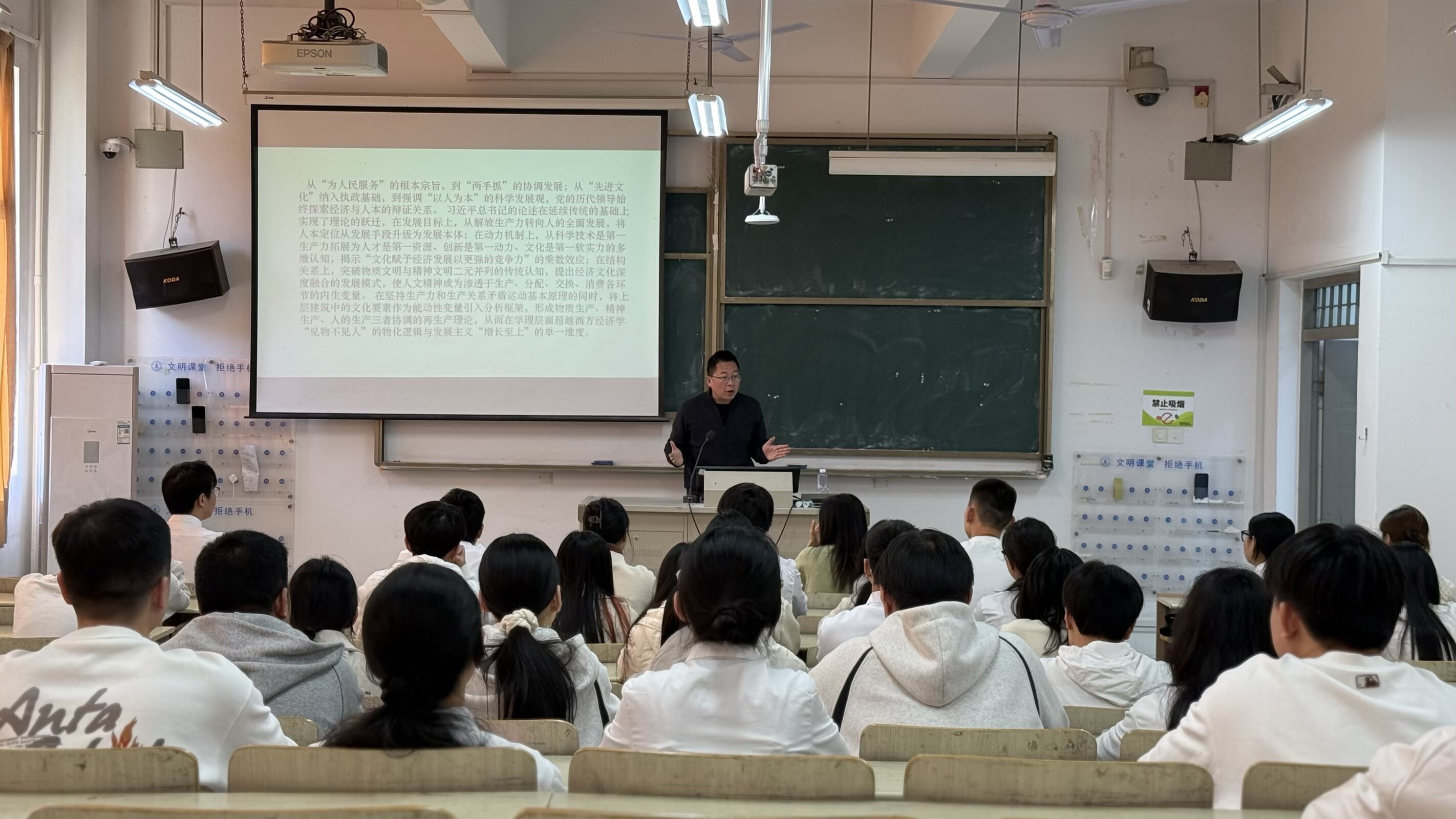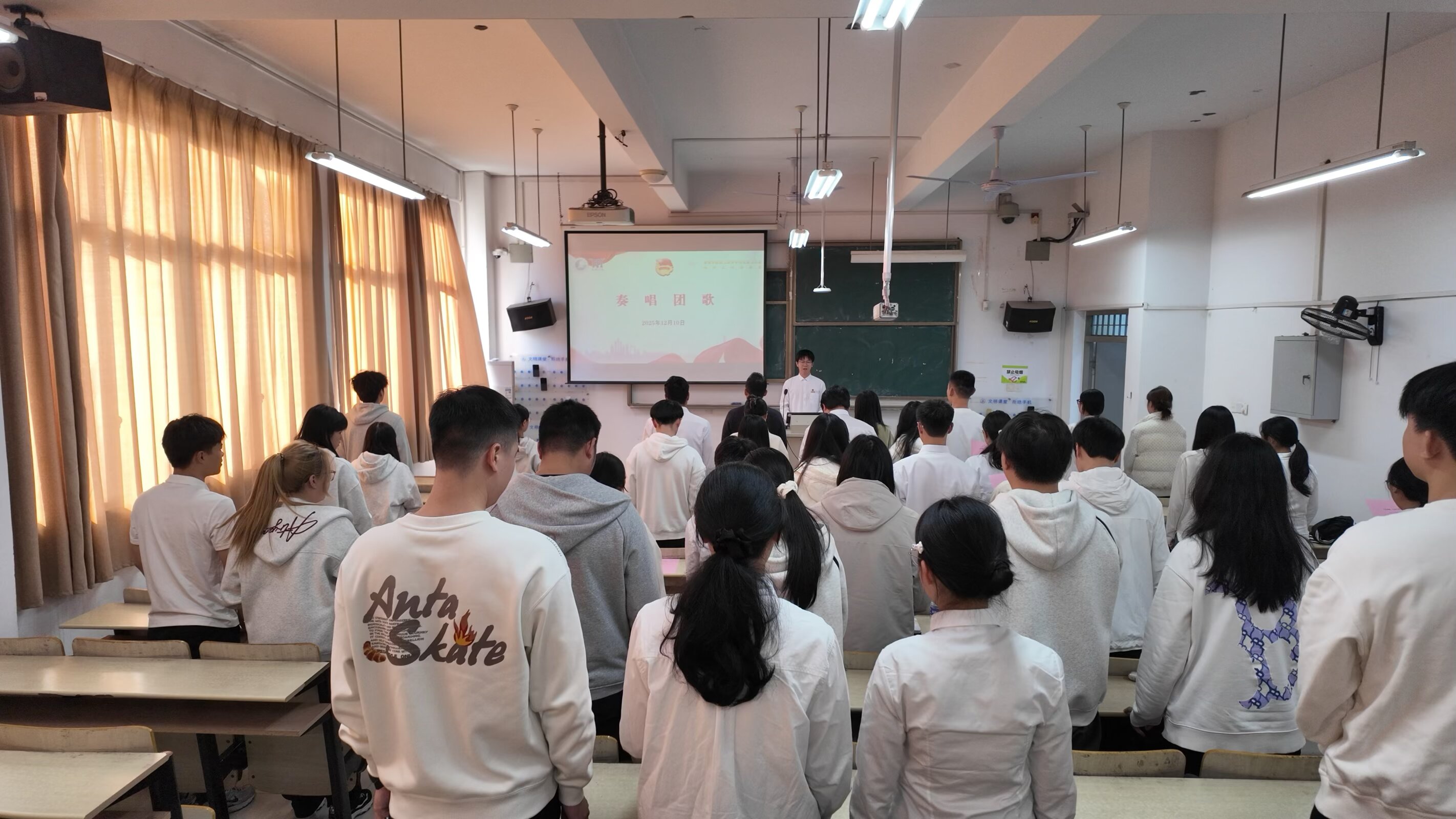 活动伊始,全场起立奏唱团歌,激昂的旋律回荡在教室中,展现出青年学子昂扬向上的精神风貌。随后,郑舒翔老师从人文经济学视野切入,结合党的二十届四中全会公报中一些新的观点,以深厚的理论功底和丰富的实践经验,围绕马克思主义青年观、新时代青年使命担当等核心内容展开授课。他结合鲜活案例与时代背景,深入浅出地阐释了马克思主义的真理力量,引导青年学子将个人理想融入国家发展大局,在奋斗中实现人生价值。